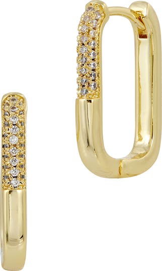 Pavé cubic zirconia bring elegant sparkle to polished rectangular hoop earrings plated in warm 18-karat gold.