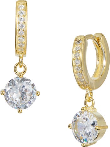 A pavé huggie earring is elongated with the elegant addition of a prong set CZ drop for a polished and sophisticated look.