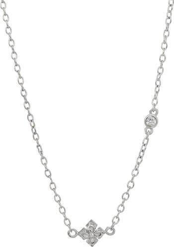 Princess-cut cubic zirconia frame a mini clover pendant on this dainty necklace crafted from polished sterling silver.