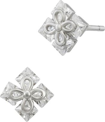 Princess-cut cubic zirconia frame these dainty clover stud earrings crafted from polished sterling silver.