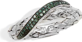 Rhodium Plated Sterling Silver Green Diamond Woven Band Ring