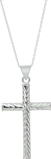 A rich texture distinguishes the cross-shaped pendant handing off this dainty chain necklace to show a display of faith.