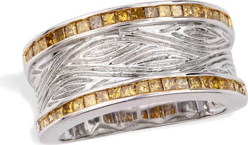Slender carved lines detail the center of this wide band ring crafted in sterling silver and bordered with square-cut yellow diamonds.