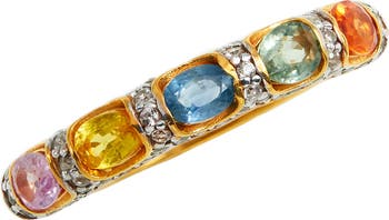 Multicolor oval cut sapphires with dainty CZ accents adorn a lustrous yellow gold vermeil ring for beautiful sparkle.