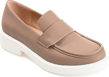 Resting on a white platform sole, this slip-on loafer features exposed seams and a penny strap from timeless style.