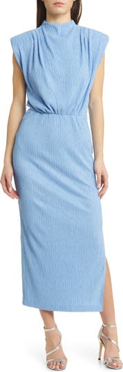 Shoulder pads, crinkly pleats, an elastic waist and a draped bodice give this stretchy midi dress a stunning silhouette.
