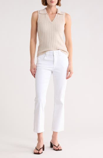 Scallop frayed hems enhance the relaxed vibe of these mid-rise flare-leg jeans cut from stretch cotton-blend denim in a cropped silhouette.