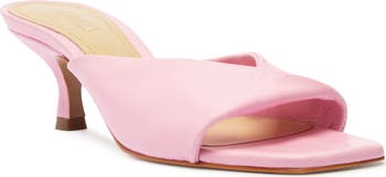 A twisted band brings delightful asymmetry to this versatile slide sandal framed by an angular toe and sculptural heel.