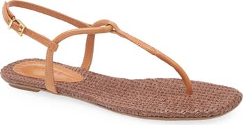 An adjustable slingback strap and center toe post offer a secure fit on a minimalist sandal rendered in metallic leather for visual intrigue.