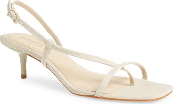 A center toe post and adjustable slingback strap offer a secure fit on a minimalist sandal balanced by an angular square toe and tapered heel.