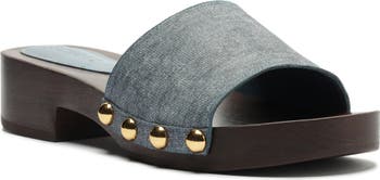 Round studs gleam at the sides of this walkable slide sandal balanced on a wooden low block heel and platform.