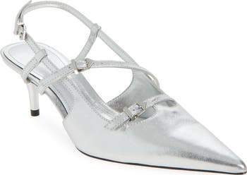 Sharp angles and a slingback strap give this contemporary pump a stunning silhouette. A bright metallic leather punctuates your sophisticated night-out style.