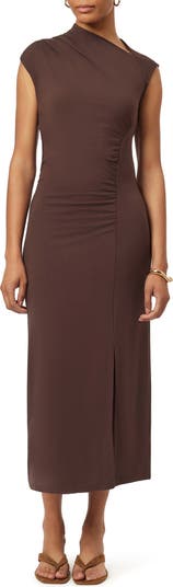 Easily go from desk to dinner in this contemporary figure-skimming dress styled with an asymmetric neckline and ruching.