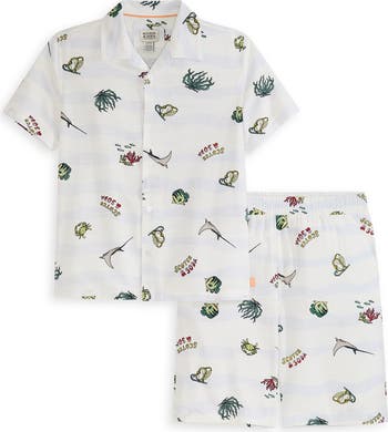 - Includes button-up shirt and shorts