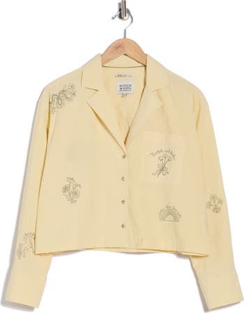 Charming assorted embroidery decorates this boxy cotton button-up designed with a notched collar and a branded patch pocket at the chest.