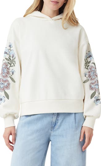 Keep your look soft and cozy in a stretch-kissed, cotton-rich hoodie cut in a relaxed fit and finished with flower embroidery at the sleeves.