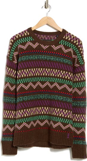This crewneck sweater features a bold geometric jacquard and relaxed drop shoulders for cozy appeal.