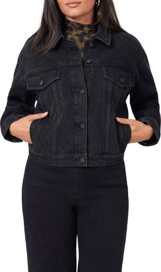 Classic denim trucker details are refined with a fitted back hem in this oversized yet cropped denim jacket.