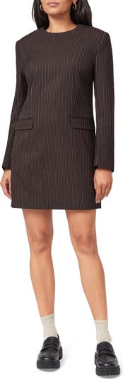Slender pinstripes run down this blazer-inspired mini cut in a shift silhouette with buttoned cuffs and flap pockets at the front.
