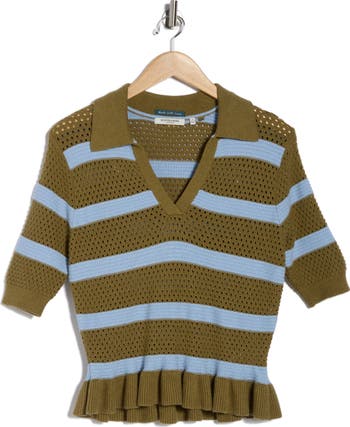 Delicate pointelle stitching textures a trim-fitting crewneck sweater that's finished with a ribbed peplum to add subtle frill.