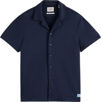 A popcorn-textured jersey adds eye-catching interest to this cool button-up camp shirt framed with short sleeves and a notched collar.