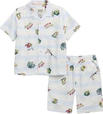 This little kids' two‑piece set features a short‑sleeve button‑front shirt with a notched collar and all‑over screenprint graphic, paired with matching elastic‑waist shorts with functional pockets for an easy, coordinated look.