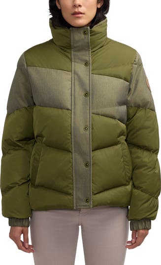 Denim-like panels add a colorblocked design to this puffer jacket topped with an oversized collar to protect you from the cold-weather.