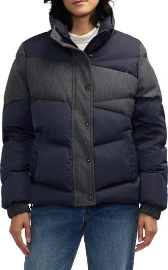 Denim-like panels add a colorblocked design to this puffer jacket topped with an oversized collar to protect you from the cold-weather.