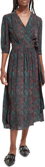 A snakeskin print in jewel tones brings subtle wildness to a graceful faux-wrap dress in a midi length.