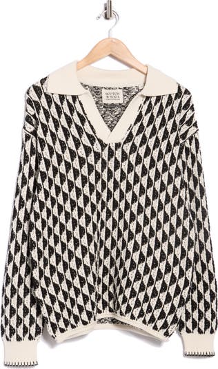 Eye-catching and cozy, this geometric jacquard sweater features rich texture and a sporty Johnny collar.