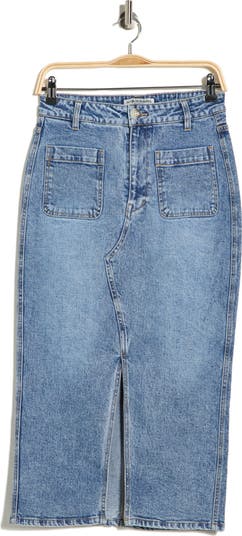 Stroll comfortably through your day in this denim pencil skirt boasting handy patch pockets for cool retro style.