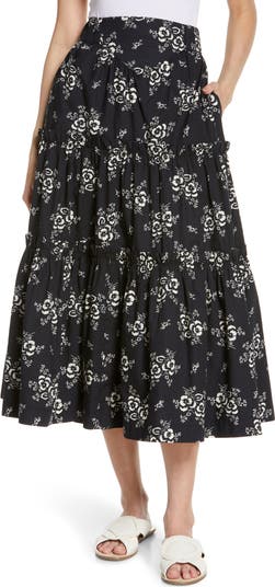 Delightful blooms sweeten this breezy cotton midi styled in a tiered silhouette with fanciful frilly details.