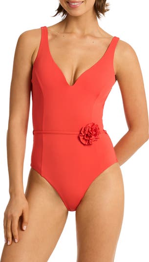 A rosette detail at the waist adds to the romantic flair of this one-piece swimsuit with a deeply scooped back and built-in powermesh.