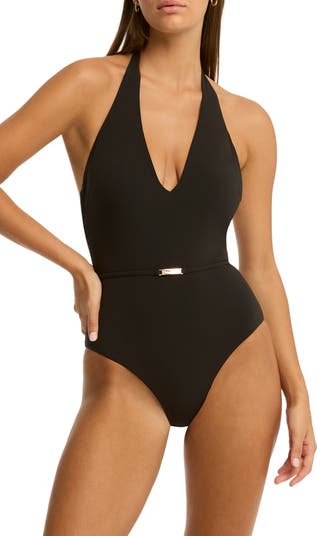 A plunging neck with halter ties frames this one-piece swimsuit featuring gleaming hardware at the waist and full back coverage.