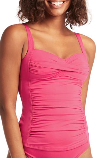 A tankini swim top flaunts bombshell curves with a twisted detail shaping the bustline, ripples of ruching and powermesh support.