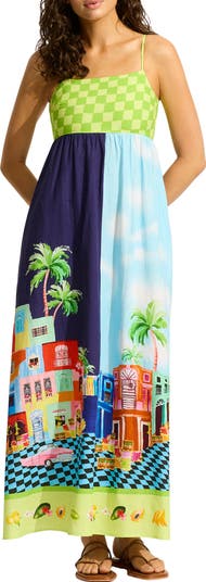 Turn heads from the beach to boardwalk in this vacay-inspired cover-up maxi dress cut from an airy linen blend in an A-line silhouette.