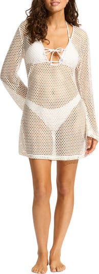 A sheer, mesh-like open weave in high-contrast black and white brings graphic allure to this plunge-neck cover-up dress secured with ties.