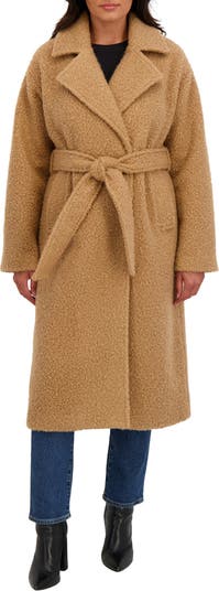 Chilly weather calls for chic layers like this longline coat made from curly bouclé and styled with a tie belt and notched collar.