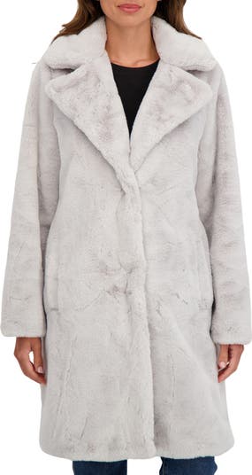 Stay cozily warm when the temperature drops in this long coat made from faux fur and framed with a notched collar.