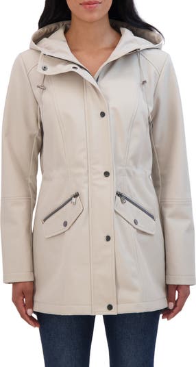 Stay dry in this wind- and water-resistant hooded softshell coat constructed with knit underarm panels for added comfort.