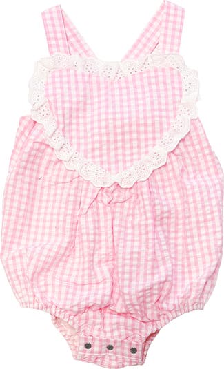 A frilly eyelet heart sweetens this seersucker romper made from breathable cotton for baby's comfort.
