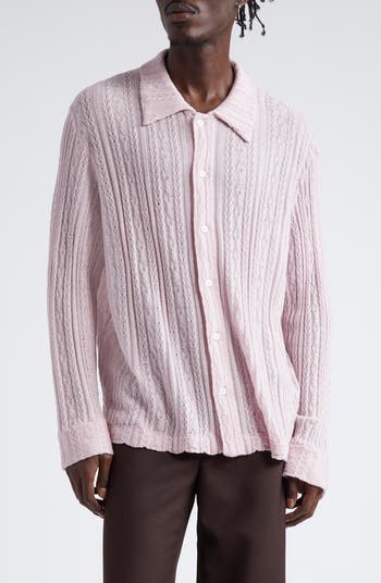 This sheer cardigan is knit from fine merino-wool yarn in a mix of delicate cable and pointelle stitches and features a relaxed yet slim fit that makes it perfect for wearing as a shirt.
