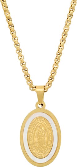 18K gold plating adds a luxurious finish to this classic Guadalupe themed pendant necklace.