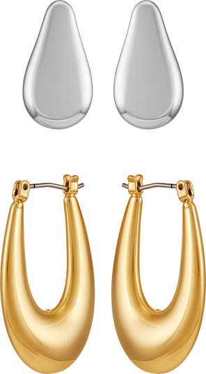 Mix up your look with this two-tone earrings set including glossy teardrops and oval hoops boasting a high-shine finish.