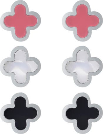 Refresh your jewelry collection with this trio of clover studs boasting lustrous mother-of-pearl or enamel in plating of your choice.