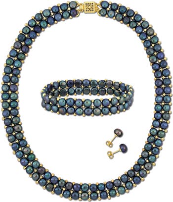 Accessorize with the timeless sophistication of this set of stud earrings, a necklace and a matching bracelet that showcases lustrous freshwater pearls.