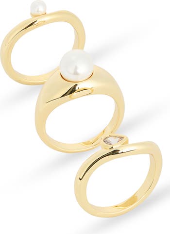 A trio of demi-fine rings topped with sparkling cubic zirconia and faux pearls can be worn stacked together or solo.