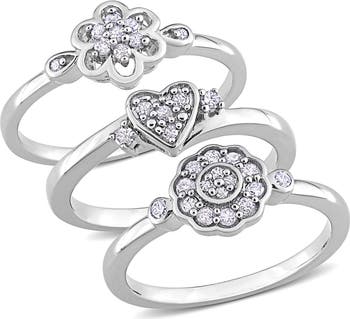 This complementary set of sterling silver rings topped with prong-set diamonds light up your every gesture.