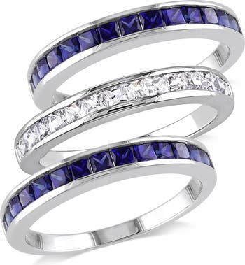 Perfect to stack or wear solo, this set of three sterling silver rings showcases channel-set lab-created blue and white sapphires for elegant sparkle.