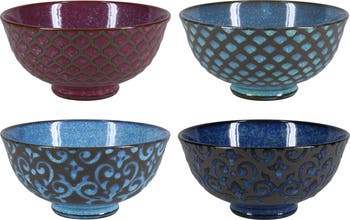 An assortment of glazed patterns define a set of deep ceramic bowls to update your kitchen aesthetics.